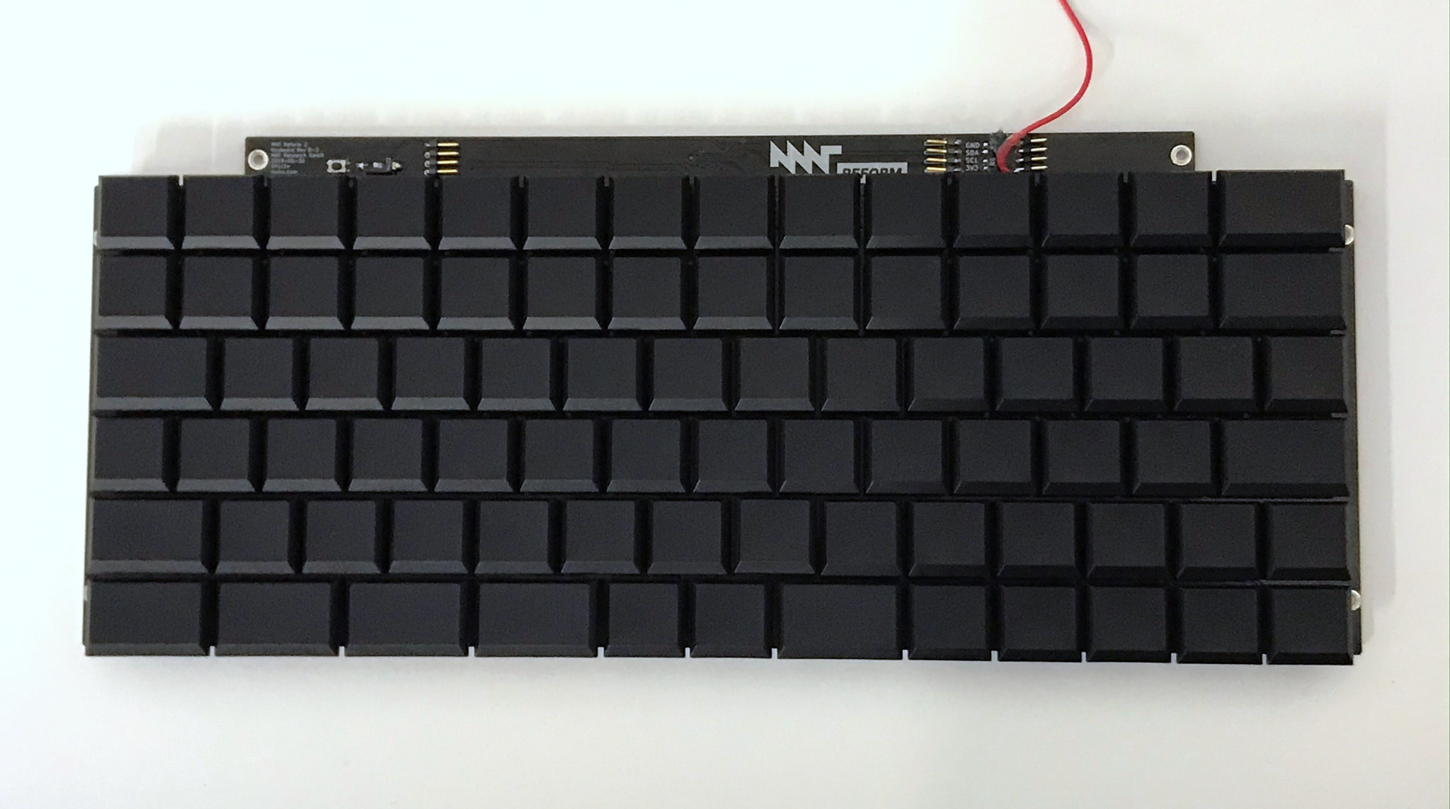 We iterated on the keyboard a few times to arrive at a layout that is a successful tradeoff between ergonomics and cost: